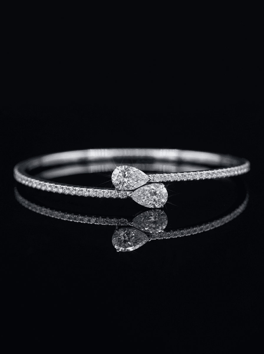 Elegant bangle bracelet in 18KT white gold, featuring two pear-cut diamonds with a delicate diamond-set band. A timeless piece that adds soft sparkle and effortless elegance.