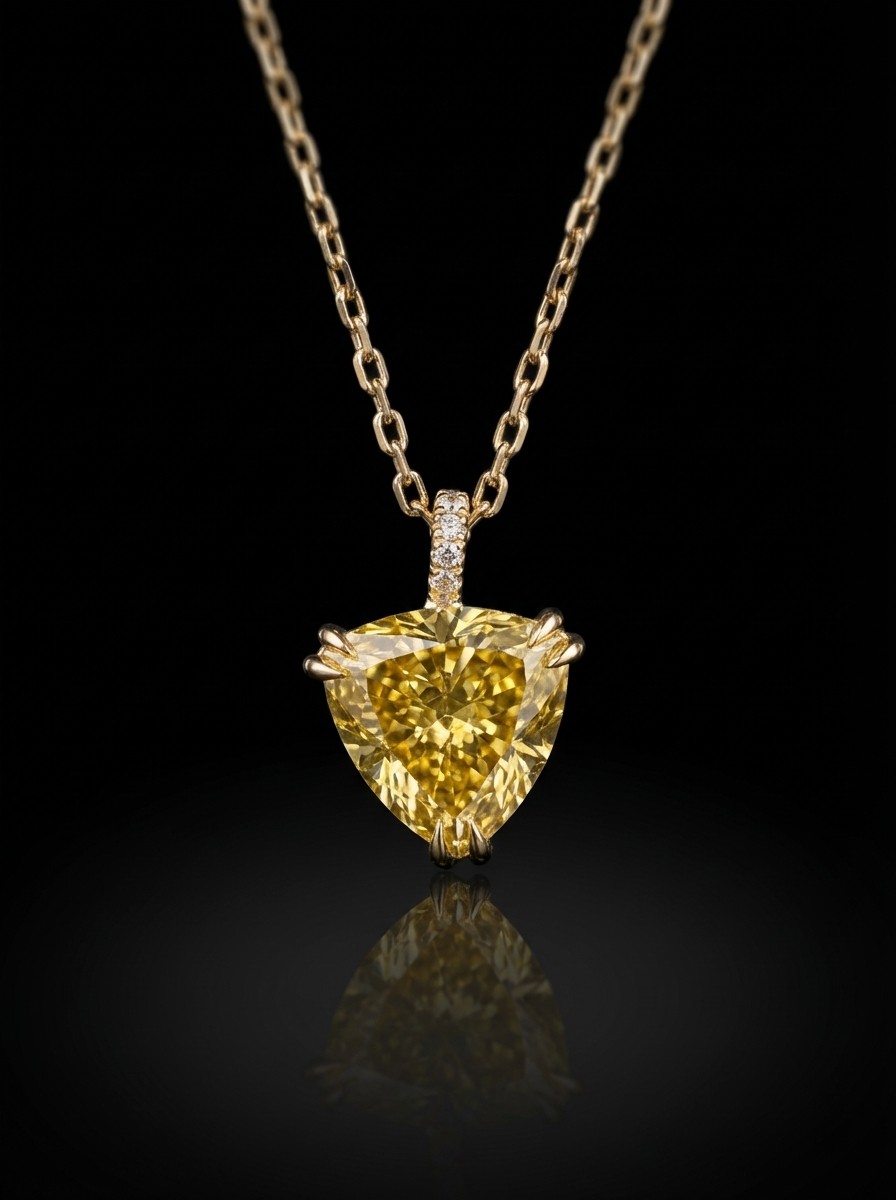 A distinctive pendant crafted in 18KT yellow gold, featuring a striking triangular-cut fancy vivid yellow diamond as its centerpiece. Accented with delicate surrounding diamonds, this design combines bold geometry with refined brilliance, creating a modern statement piece with timeless appeal. Our necklaces come in a timeless standard length of 45–50 cm, and can always be adjusted to your perfect fit.