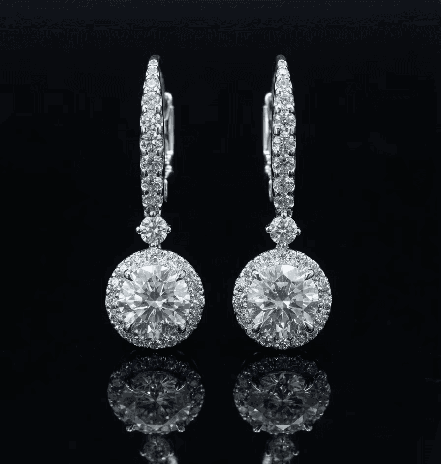 Refined earrings in 18KT white gold, featuring round brilliant diamonds surrounded by a delicate halo of smaller stones. A timeless piece that blends classic elegance with beautiful sparkle.