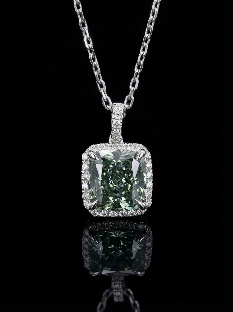 An elegant pendant in 18KT white gold, showcasing a striking cushion-cut fancy vivid green diamond at its center. Framed by a delicate halo of fine accent diamonds, this design offers vibrant color, refined brilliance, and timeless sophistication. A distinctive piece that stands out with effortless elegance. Our necklaces come in a timeless standard length of 45–50 cm, and can always be adjusted to your perfect fit.