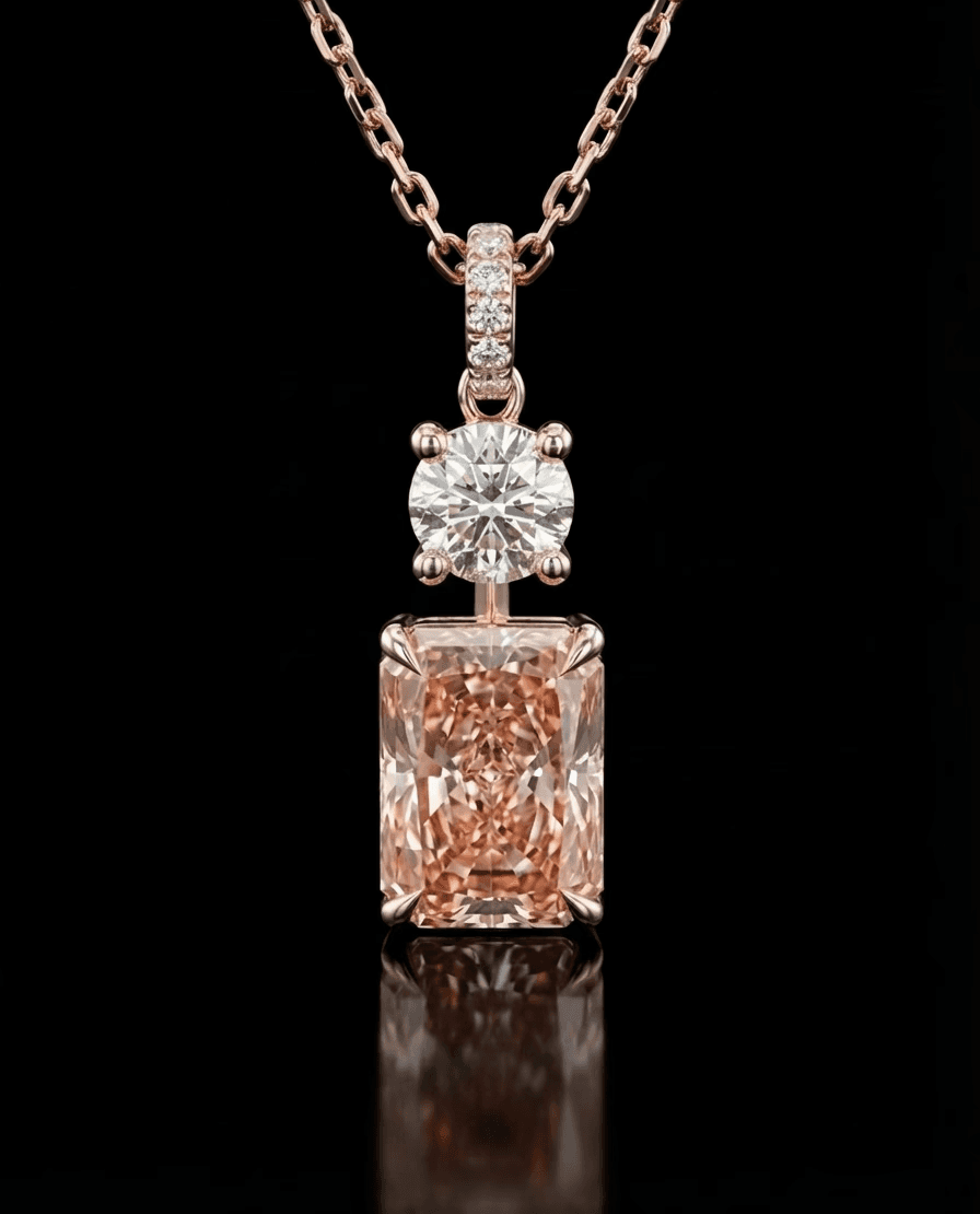 A bold and elegant pendant crafted in 18KT rose gold, featuring a radiant-cut fancy vivid orange-pink diamond as its striking centerpiece. The design is accented with fine surrounding diamonds that enhance brilliance and depth, creating a vibrant yet sophisticated statement piece. Our necklaces come in a timeless standard length of 45–50 cm, and can always be adjusted to your perfect fit.