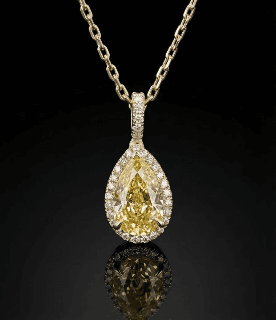 A delicate pendant crafted in 18KT yellow gold, featuring a pear-shaped fancy vivid yellow diamond as its radiant centerpiece. Surrounded by a refined halo of accent diamonds, this design offers a perfect balance of vivid color and subtle brilliance. An elegant piece designed for everyday luxury. Our necklaces come in a timeless standard length of 45–50 cm, and can always be adjusted to your perfect fit.