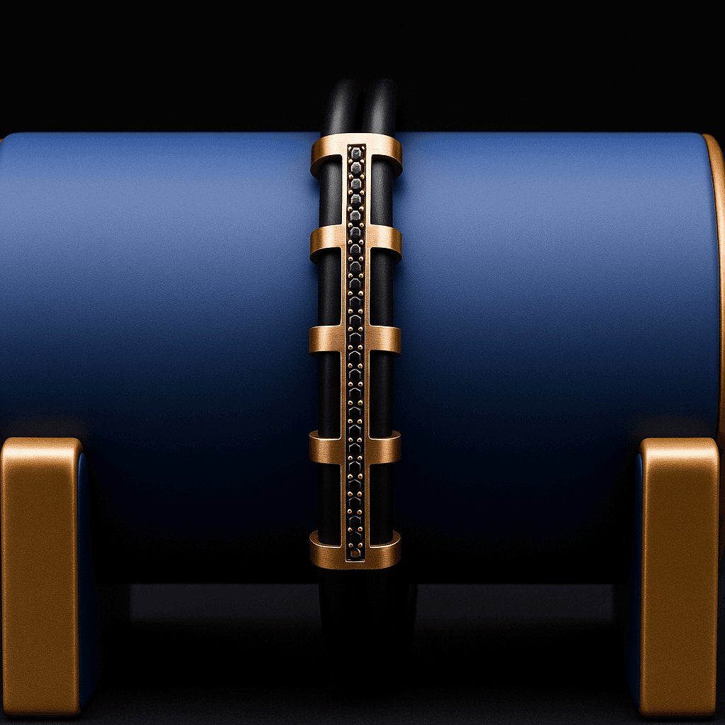 A bold 14KT gold bracelet set with natural black diamonds, offering a striking contrast and modern elegance. The clean lines and deep black brilliance create a powerful, refined statement piece, ideal for those who appreciate contemporary luxury with a distinctive edge.